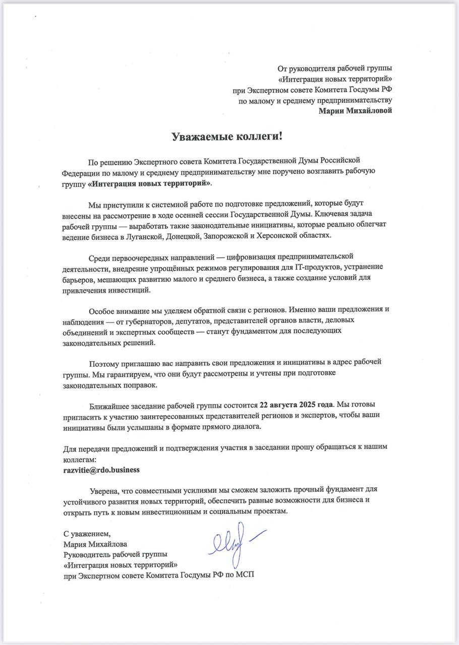 Для направления предложений и подтверждения участия в заседании 22 августа 2025 года просим присылать материалы на адрес: razvitie@rdo.business. Все поступившие инициативы будут системно обработаны рабочей группой и рассмотрены при подготовке законодательных инициатив осенней сессии Государственной Думы.